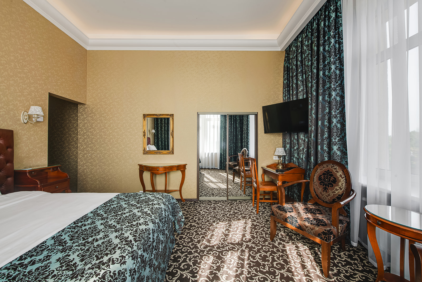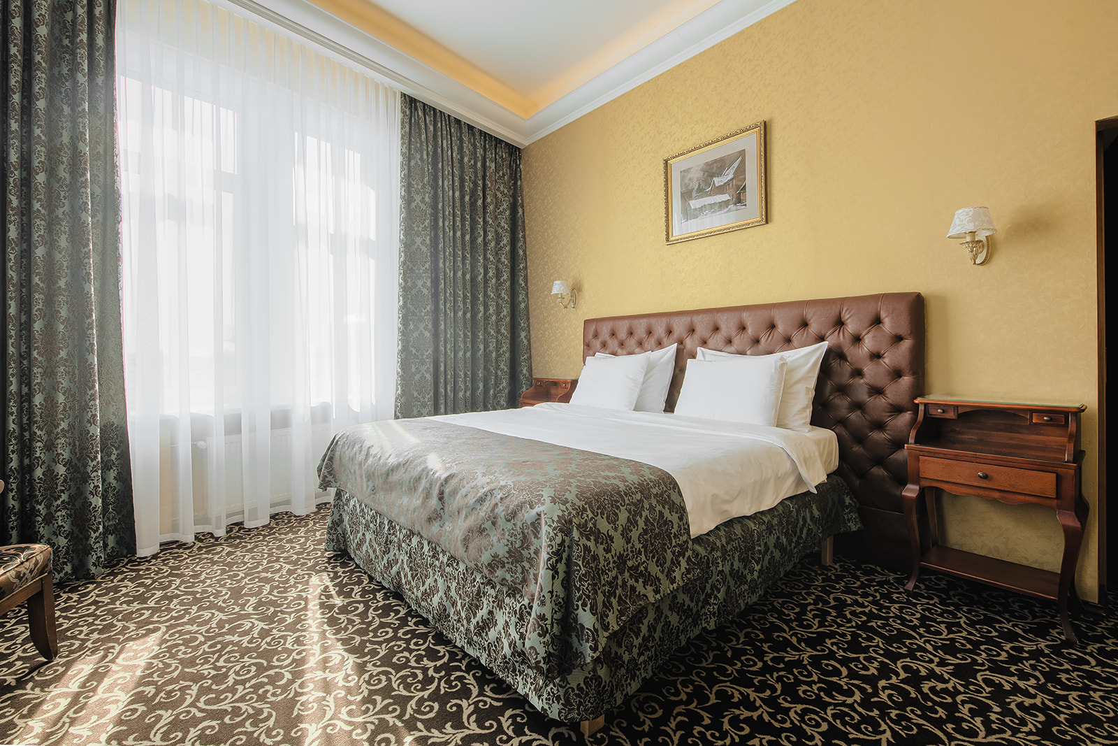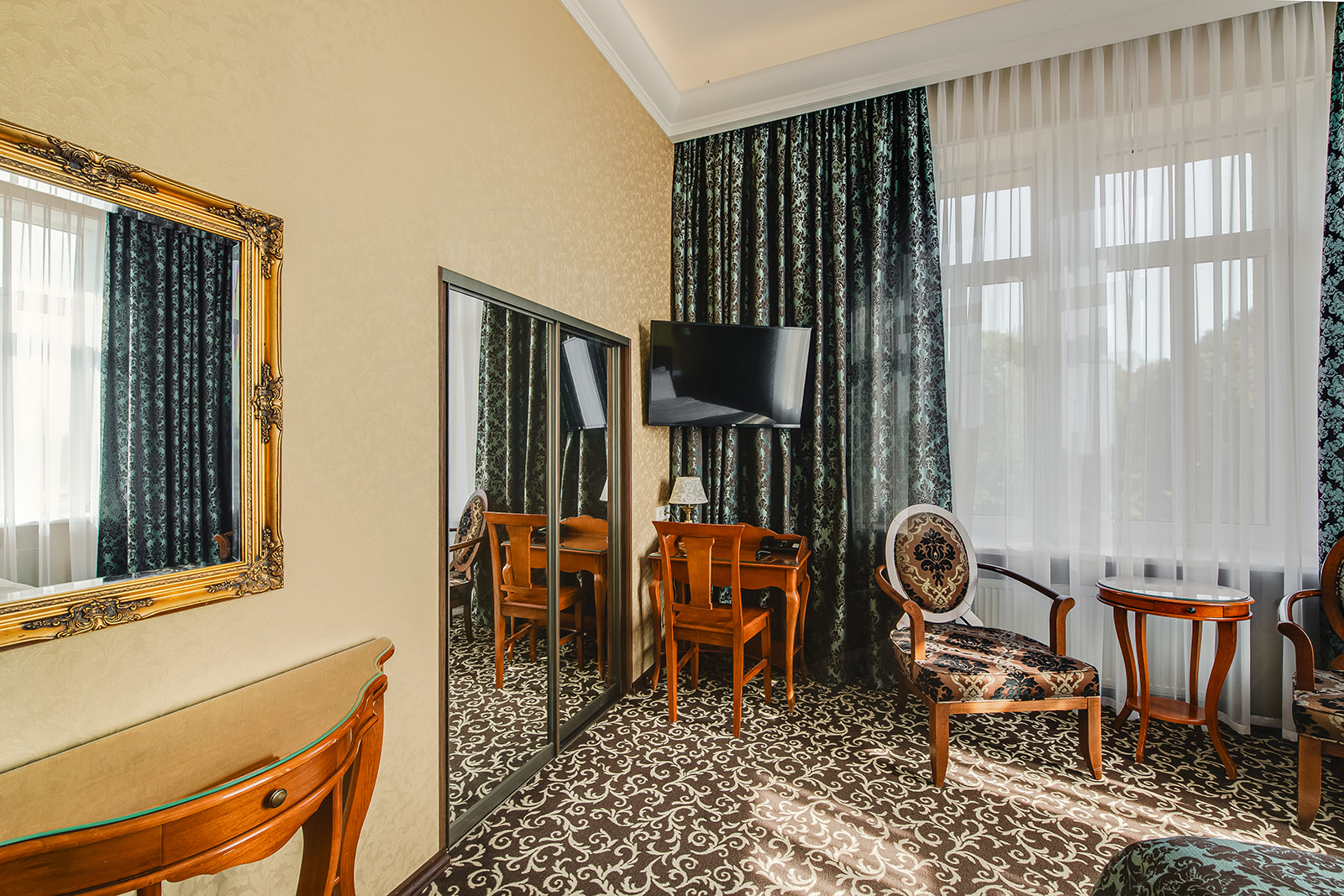 Numuri atrodas otrajā stāva, no numura logiem paveras skats uz pilsētu, klusu viesnīcas iekšpagalmu vai uz upi Driksu.